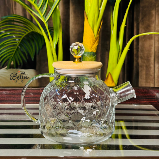 Diamond-Patterned Borosilicate Glass Teapot With Bamboo Lid And Crystal Knob