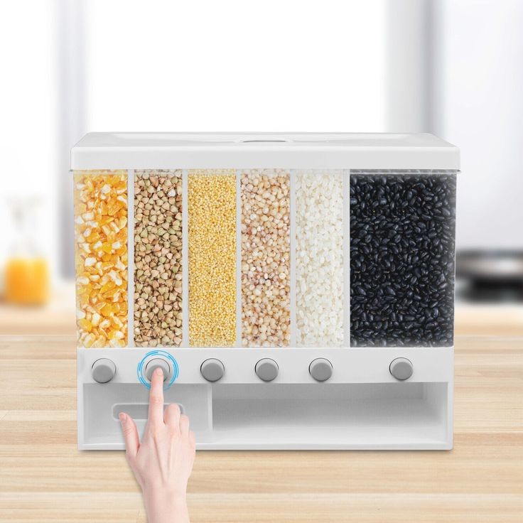 Transparent visual design, easy to distinguish what is in the container and check the grain balance at any time. 6-Grid design, you can place multi cereal. Comes with a plastic bowl, place it under the dispenser and press the button to get the controlled part.