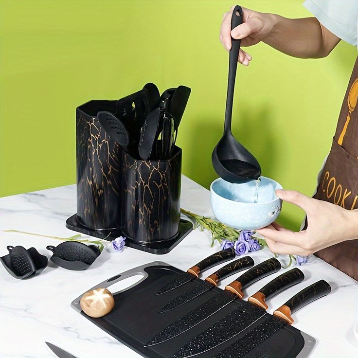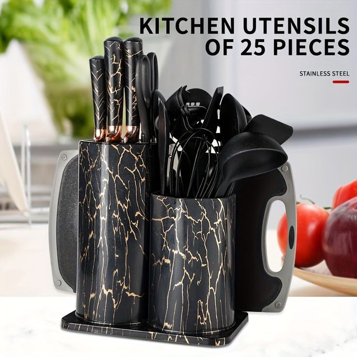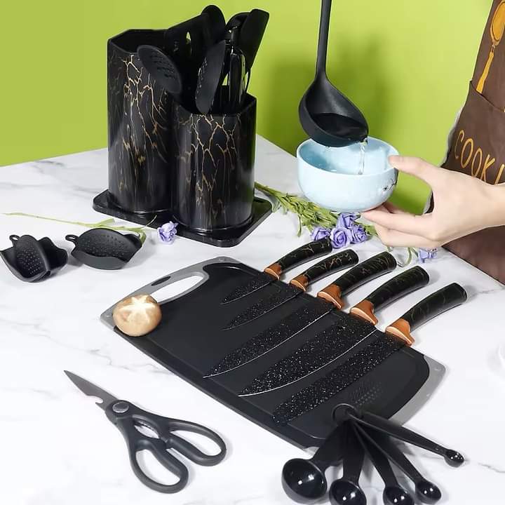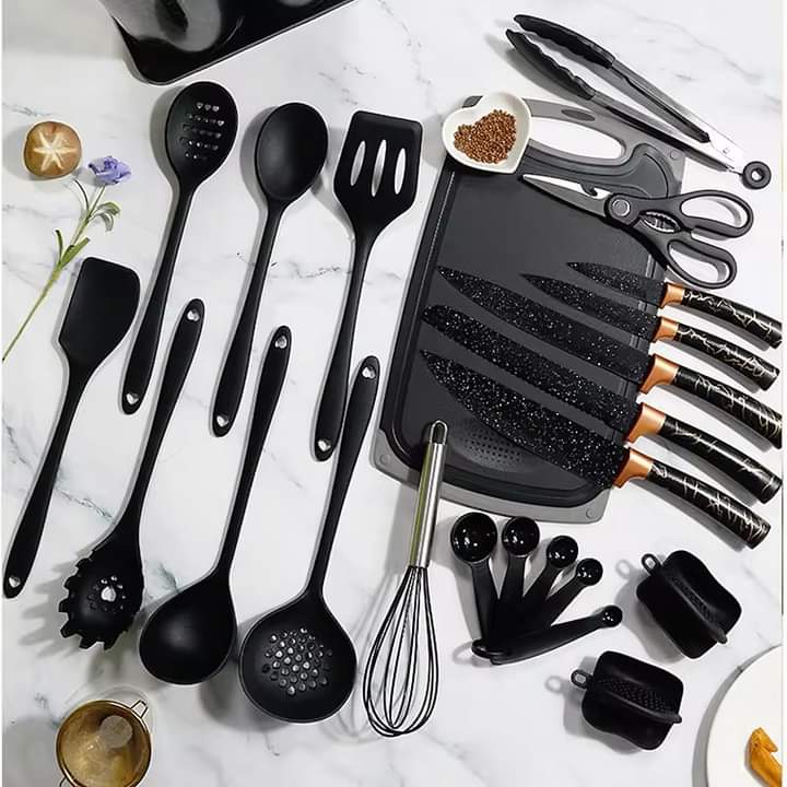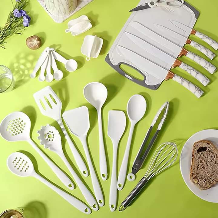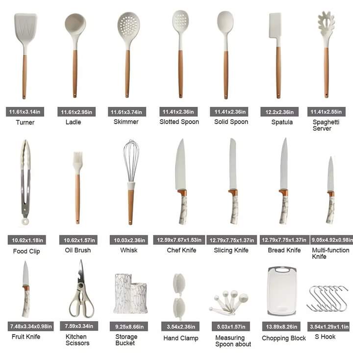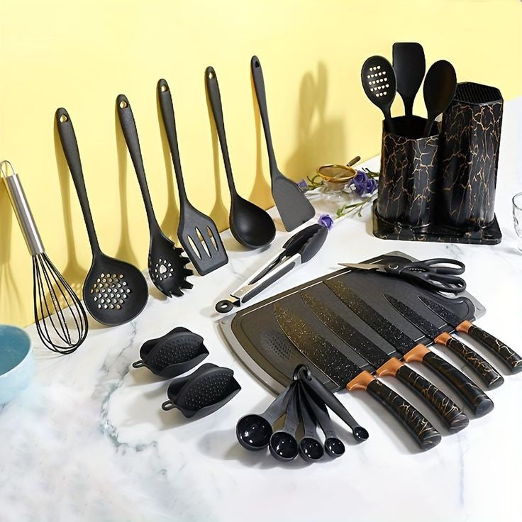 【25PCS kitchen set】This cooking utensils set includes 5-set of knives,7-silicone cooking utensils and 6-Pieces Utensil Sets Kitchen Gadgets. This Kitchen Set Almost meets all the needs for Cooking.