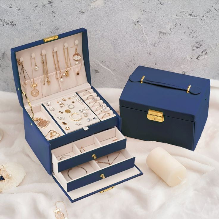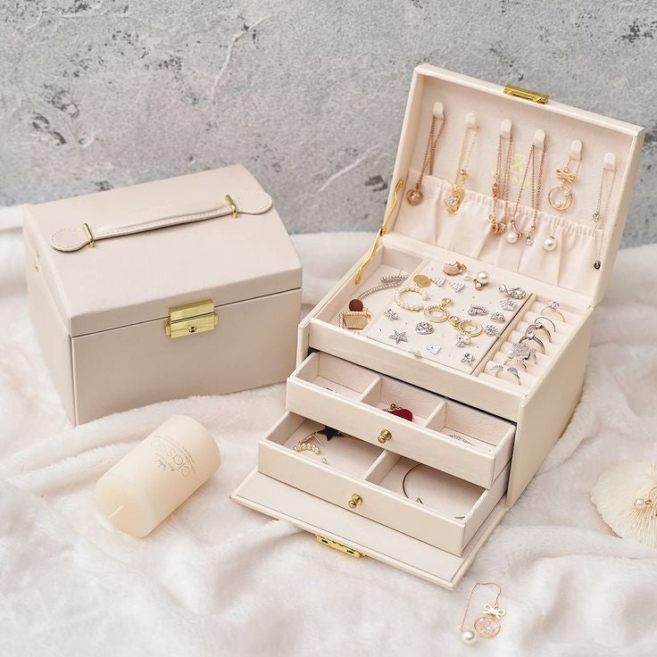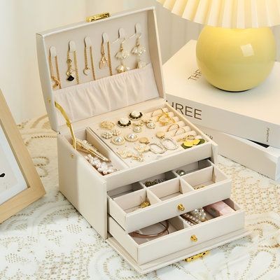 Having 3 removable square drawers, it has convenient compartments for storing necklaces, bracelets, earrings, studs, bobby pins, watches, or rings.
