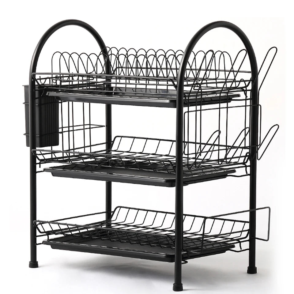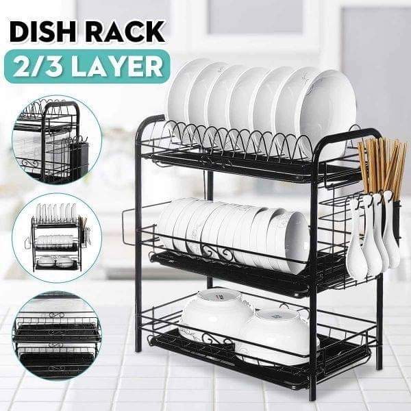 TIER PLATE ORGANIZER : Elegant 3 tier plate organizer, efficient dish drainer. The upper and lower tray that can be extended to the sides to store cutting boards and kitchen utensils, ensures that the plates, dishes and cutlery are organized and tidy.