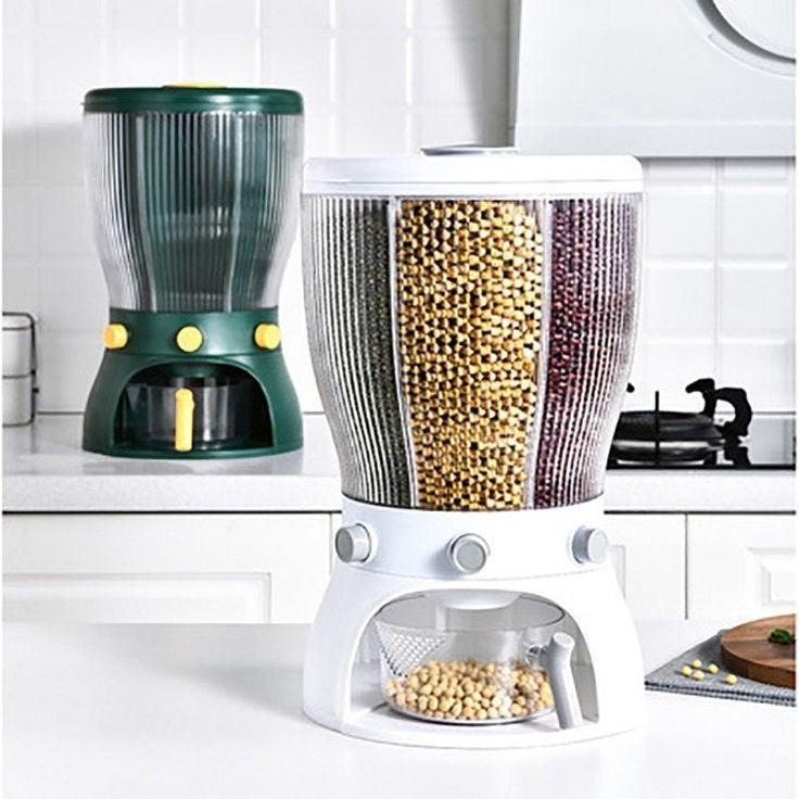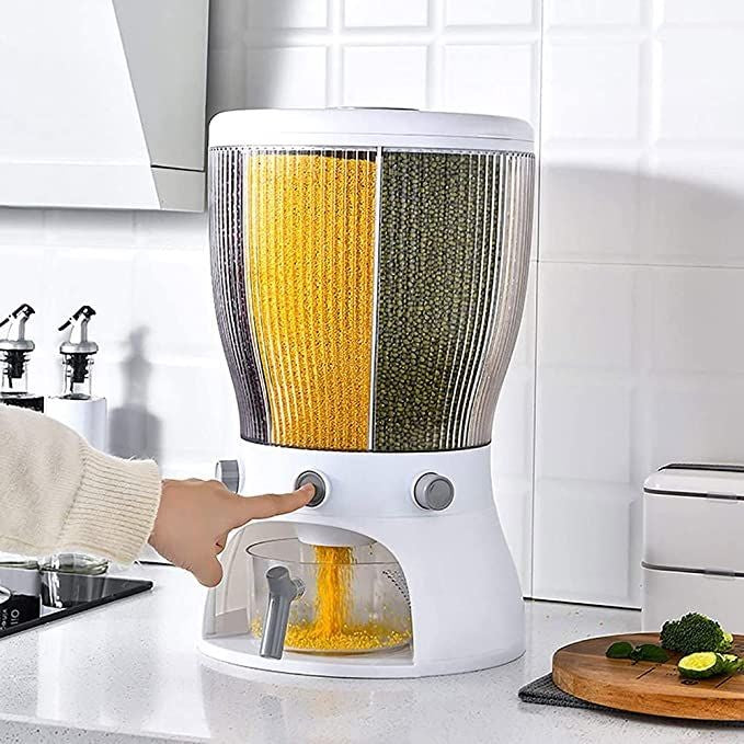 [ Intelligently Metering Rice Bucket ] -- This food storage container can automatically quantify rice and produce whole grains. The round button can be pressed with one key to intelligently quantify the rice and grain or any other food.