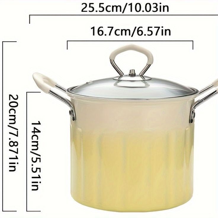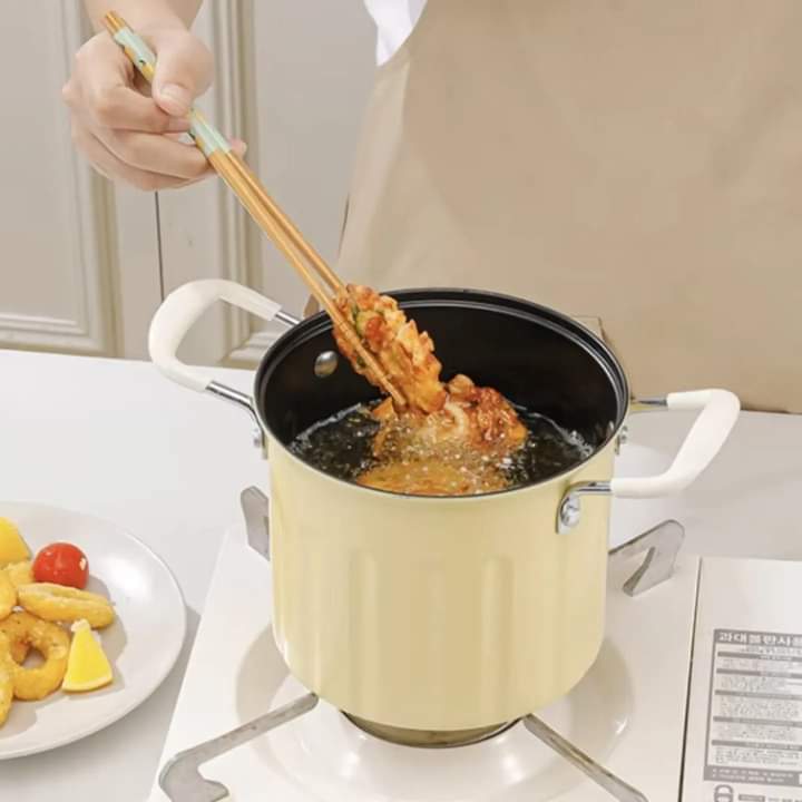 The heightened pot body prevents oil splashes, while the tempered glass lid allows for safe, visible cooking.