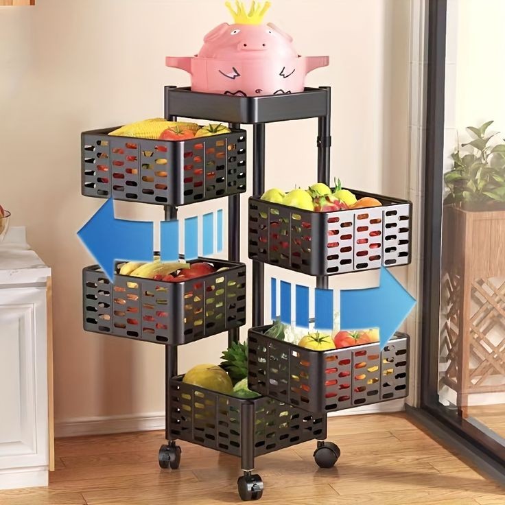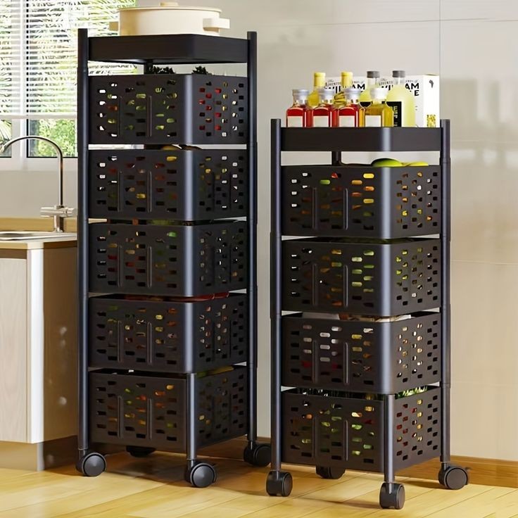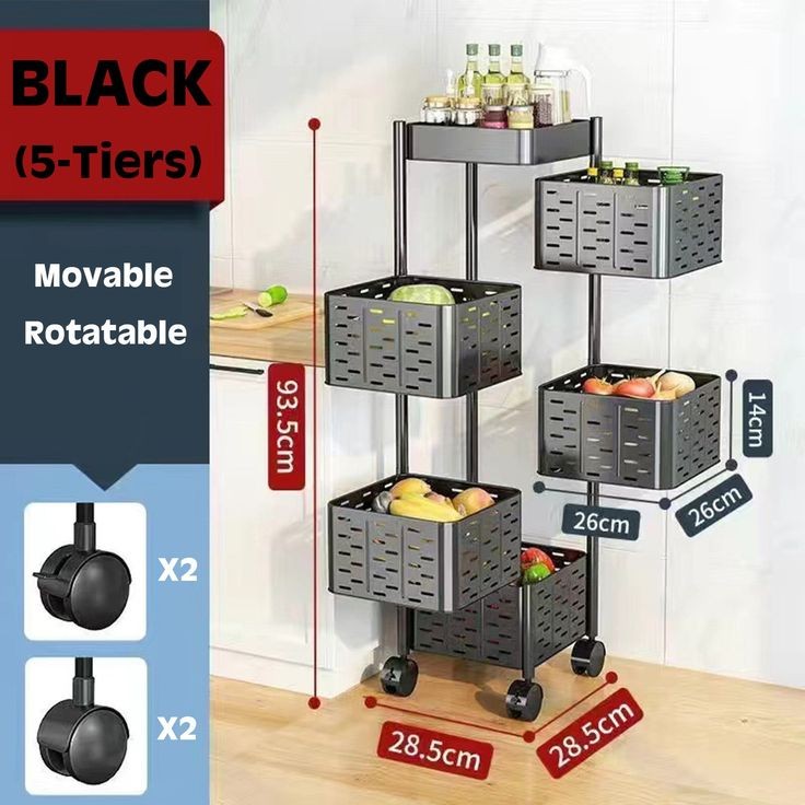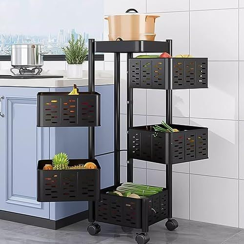 This made of premium carbon steel, with environmentally friendly spray paint treatment. Waterproof, stable and durable, it will not rust even in humid environment, for prolonged use. It can rotates 360°, lockable wheels at the bottom help it rotate effortlessly and park seamlessly in a small space. It makes cleaning much easier. It has breathable encrypted wire mesh basket and hollow design of the top allow fruits and vegetables to breathe freely and prevent them from rotting easily. It has protective barriers on both sides increase the distance between layers to protect goods from slipping. Each layer is equipped with a magnetic closure, and the mesh basket closes automatically. The top layer can accommodate electrical appliances, seasoning jars or toiletries. Each hollow basket can hold fruits, vegetables, dishes, etc.
