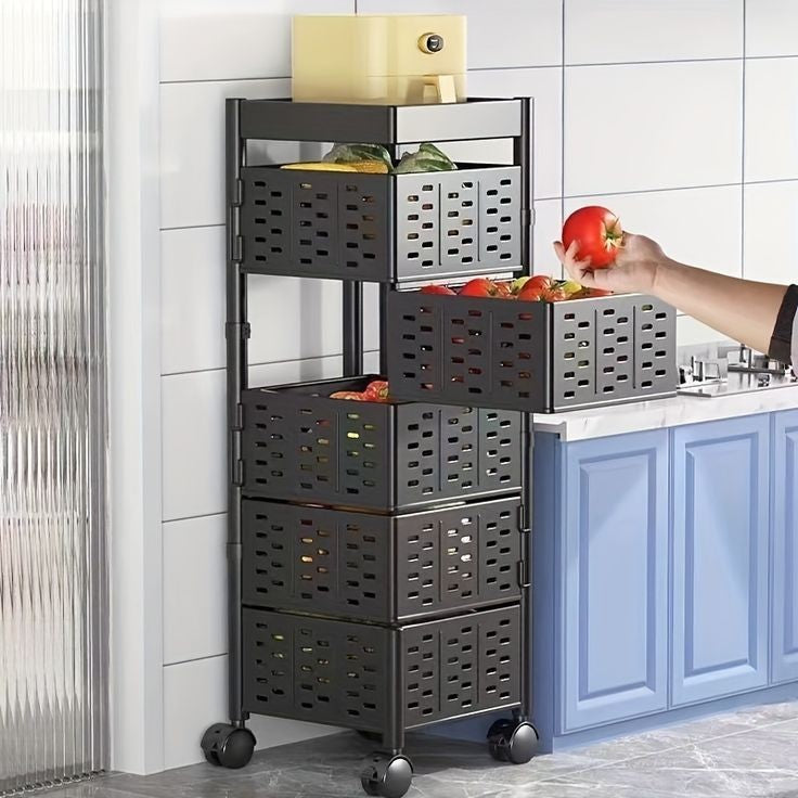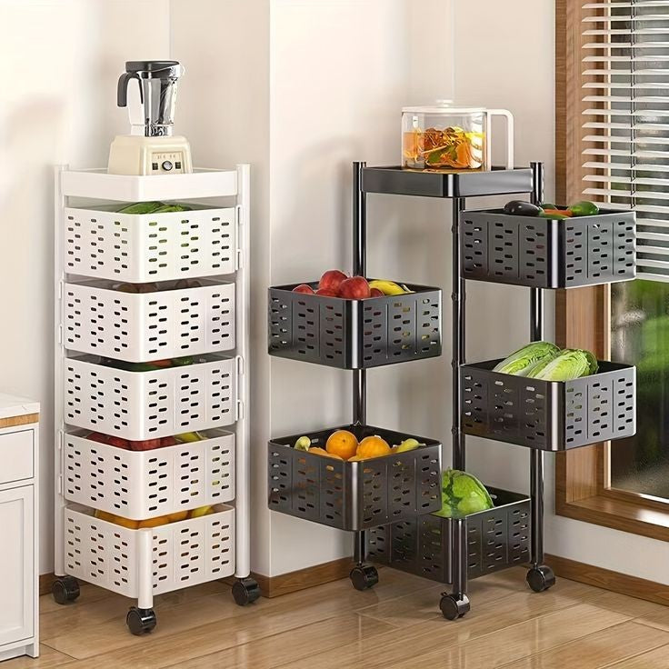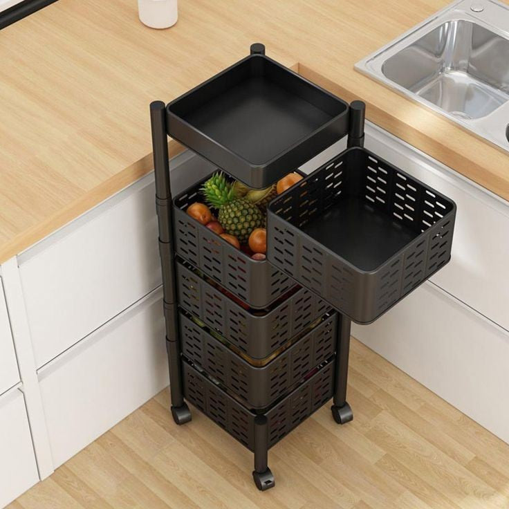 The rotating vegetable rack rotates 360° freely, lockable wheels at the bottom help it rotate effortlessly and park in a small space. Makes cleaning easier.