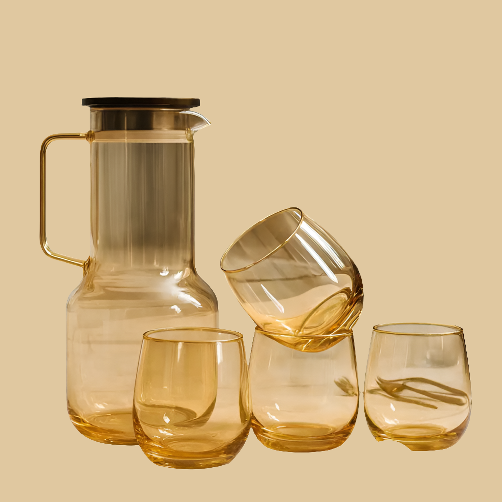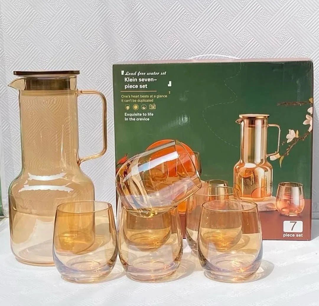 experience with the Amber Luxe 7-Piece Glassware Set, featuring 1 elegant jug and 6 matching glasses. Crafted from high- quality, lead-free glass with a stunning amber tint, this set blends luxury with functionality. The sleek jug offers a comfortable handle and a drip-free spout, while the glasses are perfectly sized for water, juice, cocktails, or your favorite beverages.