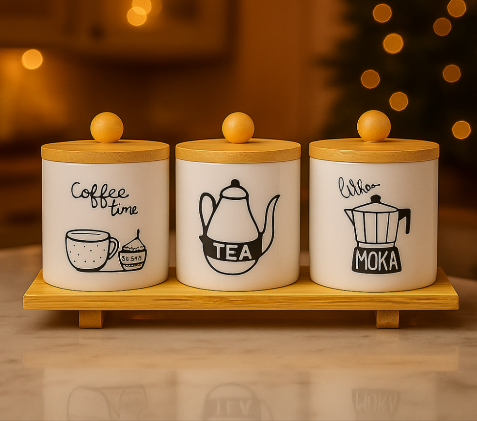 CERAMIC JAR SET WITH BAMBOO LIDS & TRAY - 3- PIECE