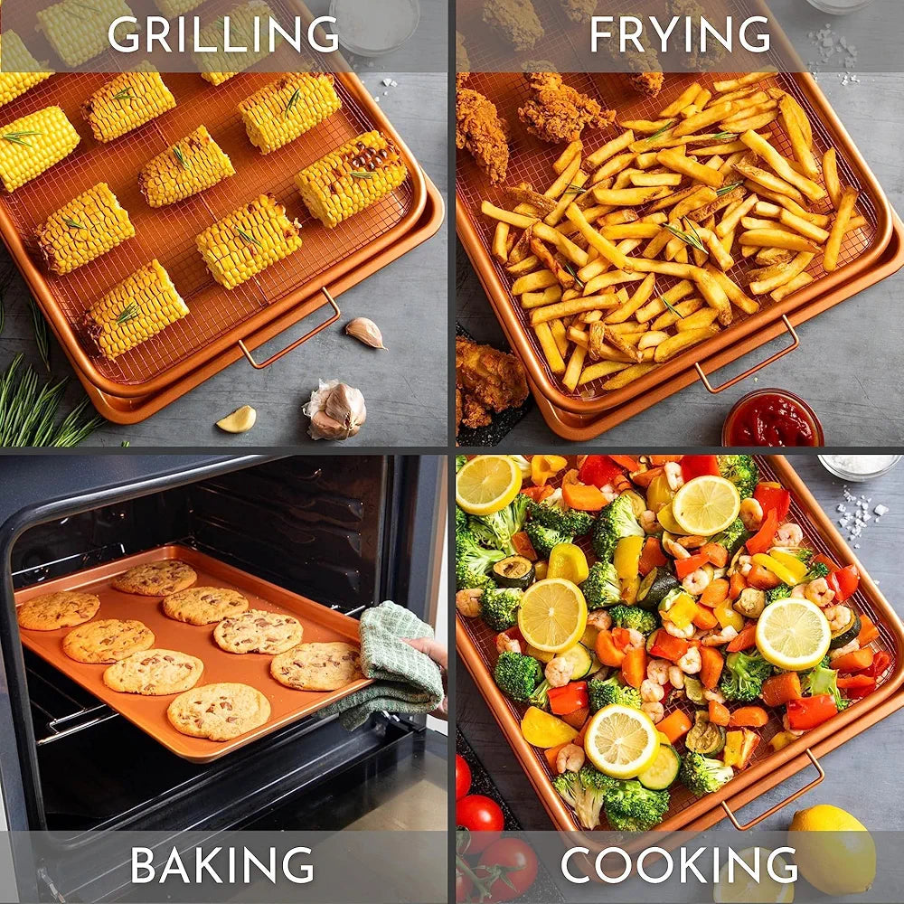 cooked meals? The Copper Crisper Tray is your solution for achieving perfectly crisp and golden-brown results every time! This innovative tray and basket set works together to roast, fry, and bake your favorite foods with ease, while keeping your oven spotless.