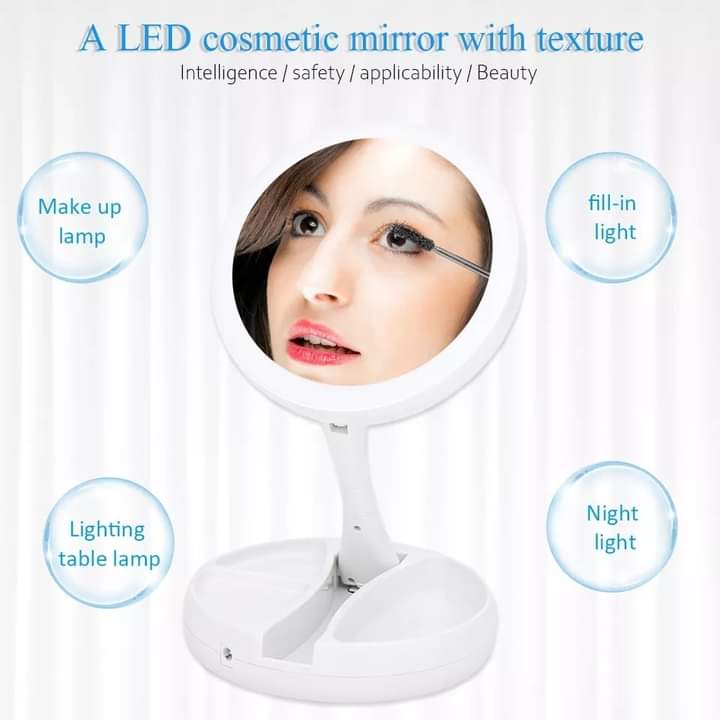 The Foldaway Mirror is a mirror that can be quickly folded out and used in any room of the house. It rests on its own stand and will also swivel and rotate. This mirror is double-sided, with one side giving you a realistic view of your face while the other side will show it at 10 times the size. What's more, with the press of a button at the bottom of the stand, you can power up LED lights that will illuminate both sides. When you are finished, My Foldaway Mirror will collapse back down into the base for easy storage and transportation. When the mirror is extended there are compartments where you can store small accessories such as hair ties or clips. The is a mirror that can be quickly folded out and used in any room of the house. It rests on its own stand and will also swivel and rotate. This mirror is double-sided, with one side giving you a realistic view of your face while the other side will show it at 10 times the size. What's more, with the press of a button at the bottom of the stand, you can power up LED lights that will illuminate both sides. When you are finished, will collapse back down into the base for easy storage and transportation. When the mirror is extended there are compartments where you can store small accessories such as hair ties or clips.