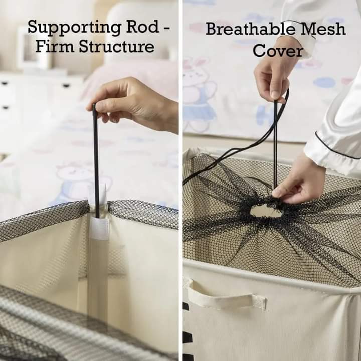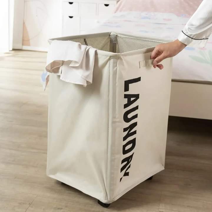 A household dirty laundry clothes storage basket. Made from fabric material, it takes shape via the internal frame that allows it to have a square shape design. It is portable due to it's side handle for easy carry and also has a mobile portable wheel to allow it to move with ease on floor surface. It also has a mesh cover to ensure stored goods don't spill out. Besides being used for dirty laundry. It can also be used for other types of household storage.